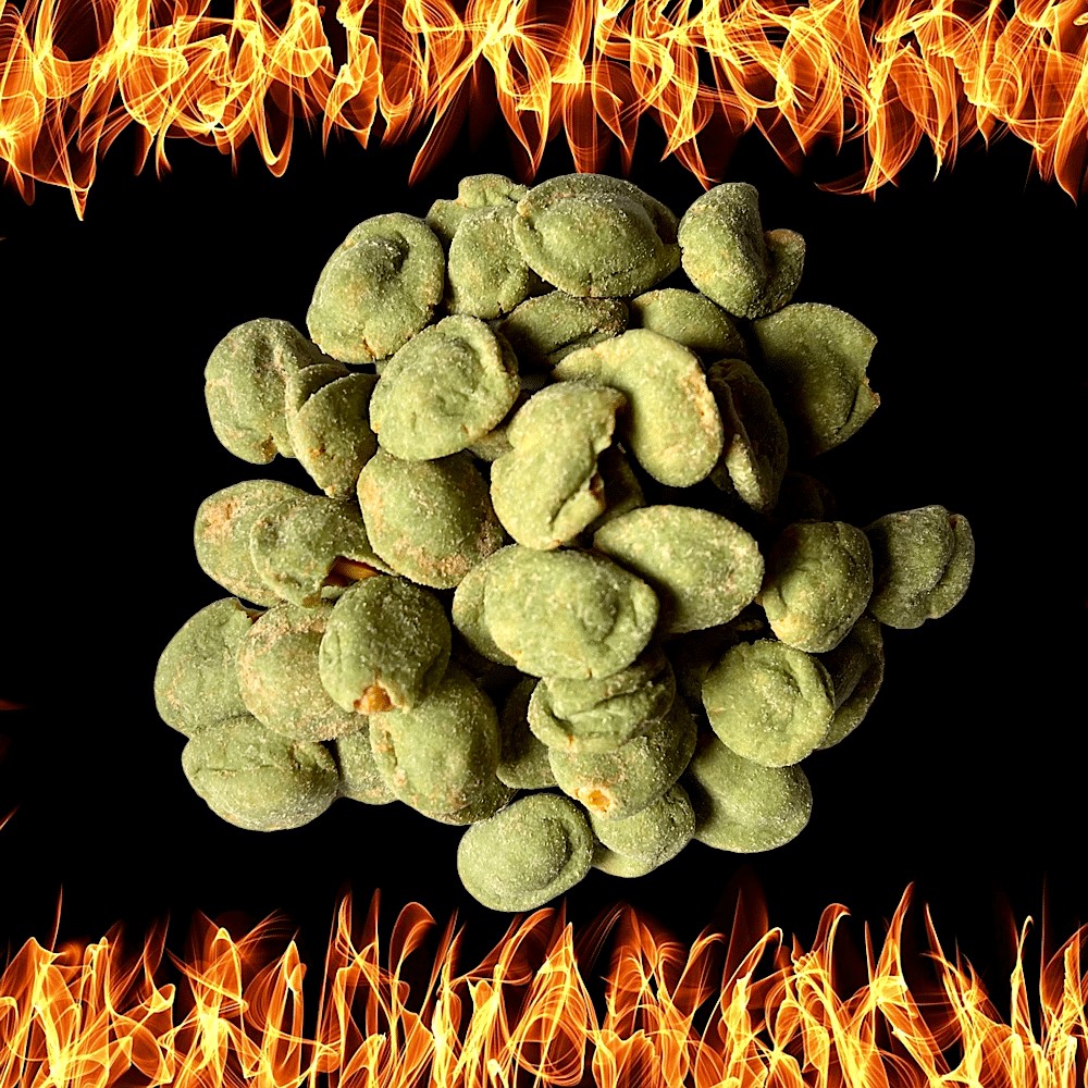 Unser scharfer Hit: grüne Wasabi-Erdnüsse. Erst ein kurzes, scharfes Prickeln von japanischem Meerretich (Wasabi) das sogleich nachlässt, wenn man auf die Nuß gebissen hat.